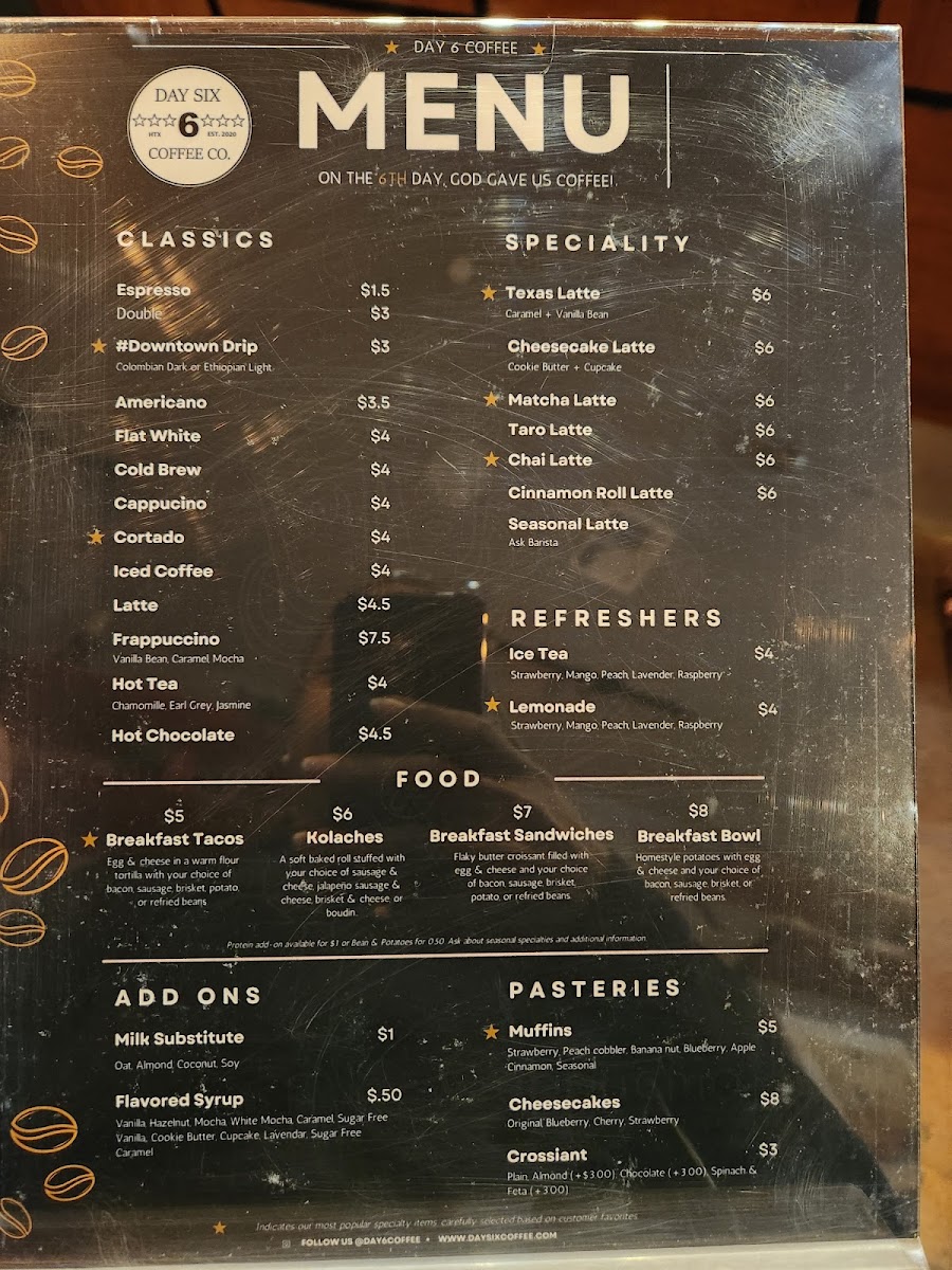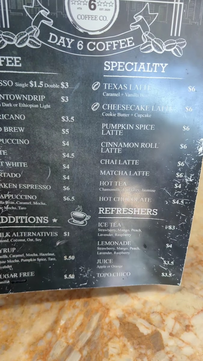 “ Day Six Coffee Shop is an absolute gem! The ambience is warm, inviting, and effortlessly stylish—perfect for relaxing or getting some work done. The location is super convenient and easy to walk to, making it a great spot for a casual stop or meet-up. I tried the Texas Latte and it was perfection—balanced, not too sweet, with just the right hints of vanilla and caramel. Bonus points for offering it as a sugar-free option! Every detail here, from the vibe to the drinks, makes Day Six a must-visit coffee spot. ”