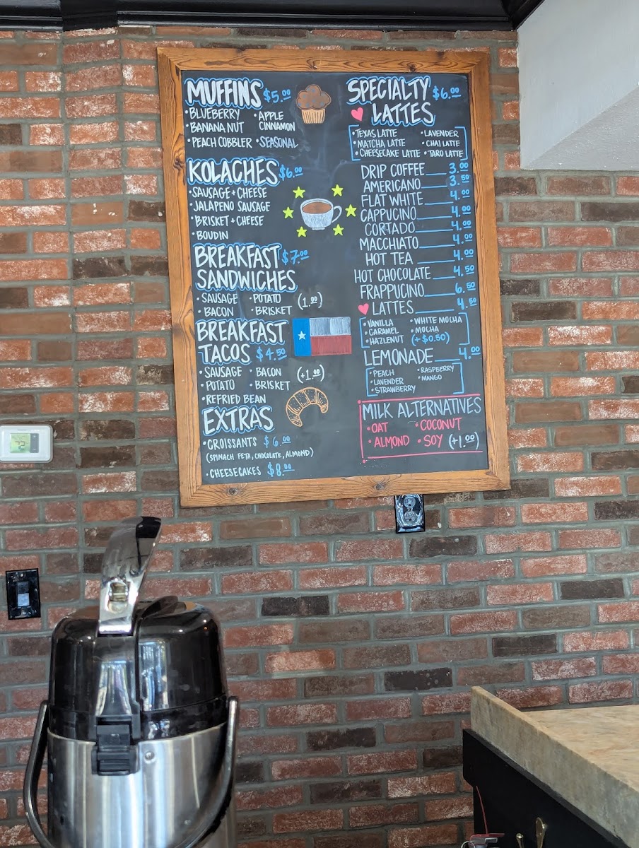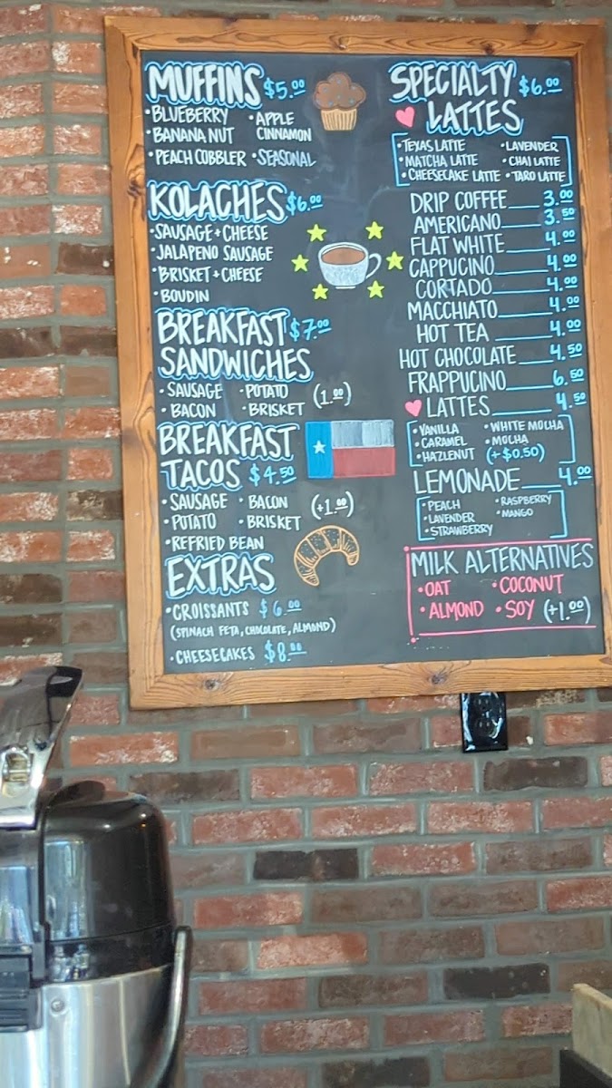 “ My vanilla latte was delicious. The barista was fantastic. The atmosphere was cozy and clean. The roll of my boudin kolache was a tad dry, but I’d probably order it again. While I didn’t try any of their breakfast items, I saw other patrons eating them while I was there and they looked delicious. ”