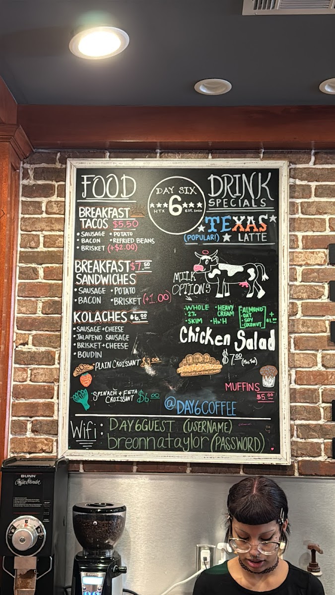 Day 6 Coffee Co. is a charming coffee shop nestled in Houston, renowned for its inviting ambiance and delightful menu. Guests can enjoy expertly crafted beverages like the Texas Latte, paired with a variety of mouthwatering food options, including kolaches and freshly baked pastries. The atmosphere strikes a perfect balance, making it an ideal spot for relaxation or productivity. Customers rave about the welcoming staff and the clean, artistic environment filled with local artwork for sale. Whether you’re stopping in for a caffeine fix or a leisurely brunch, Day 6 Coffee Co. promises an exceptional experience that keeps patrons returning for more.